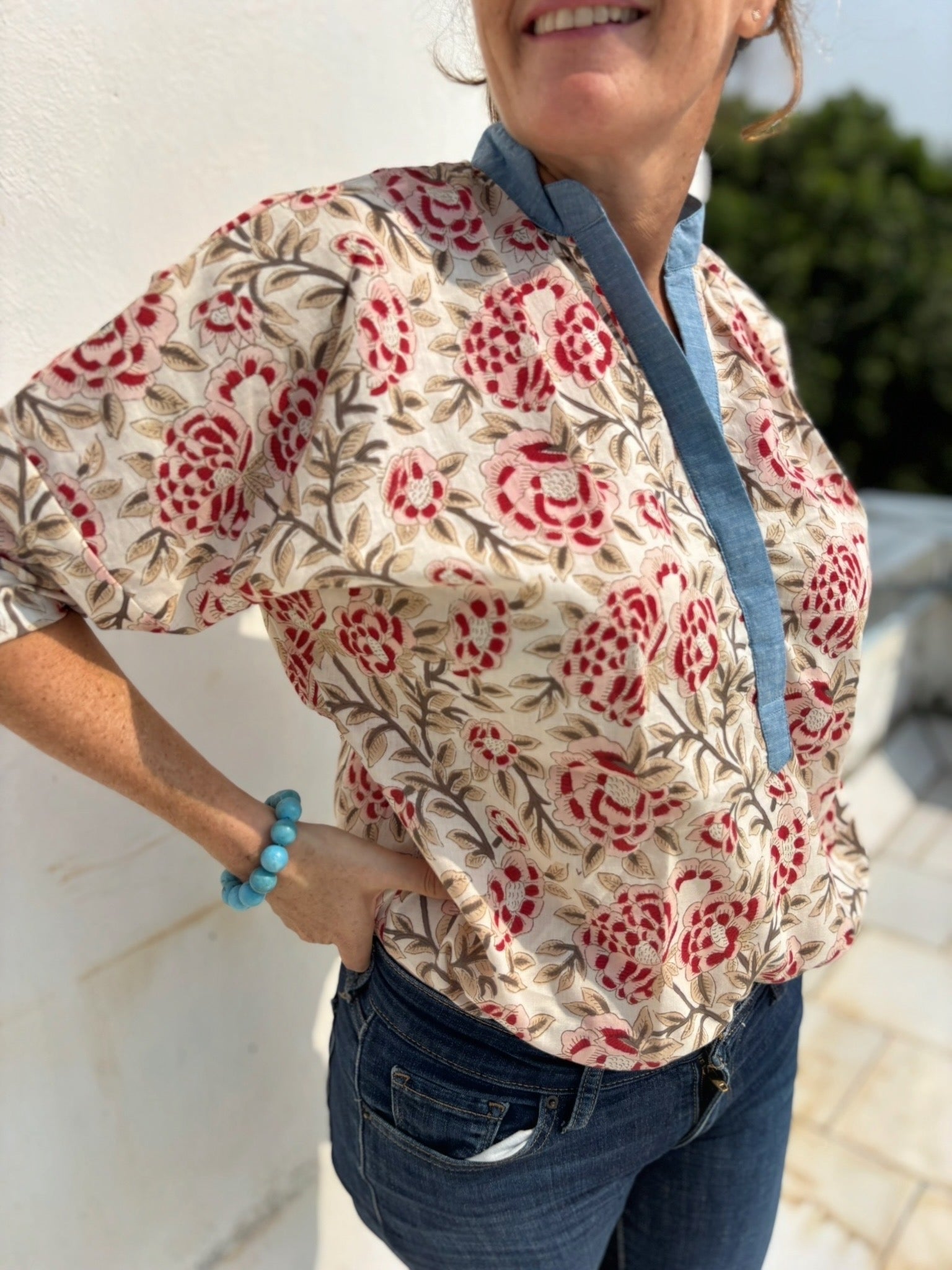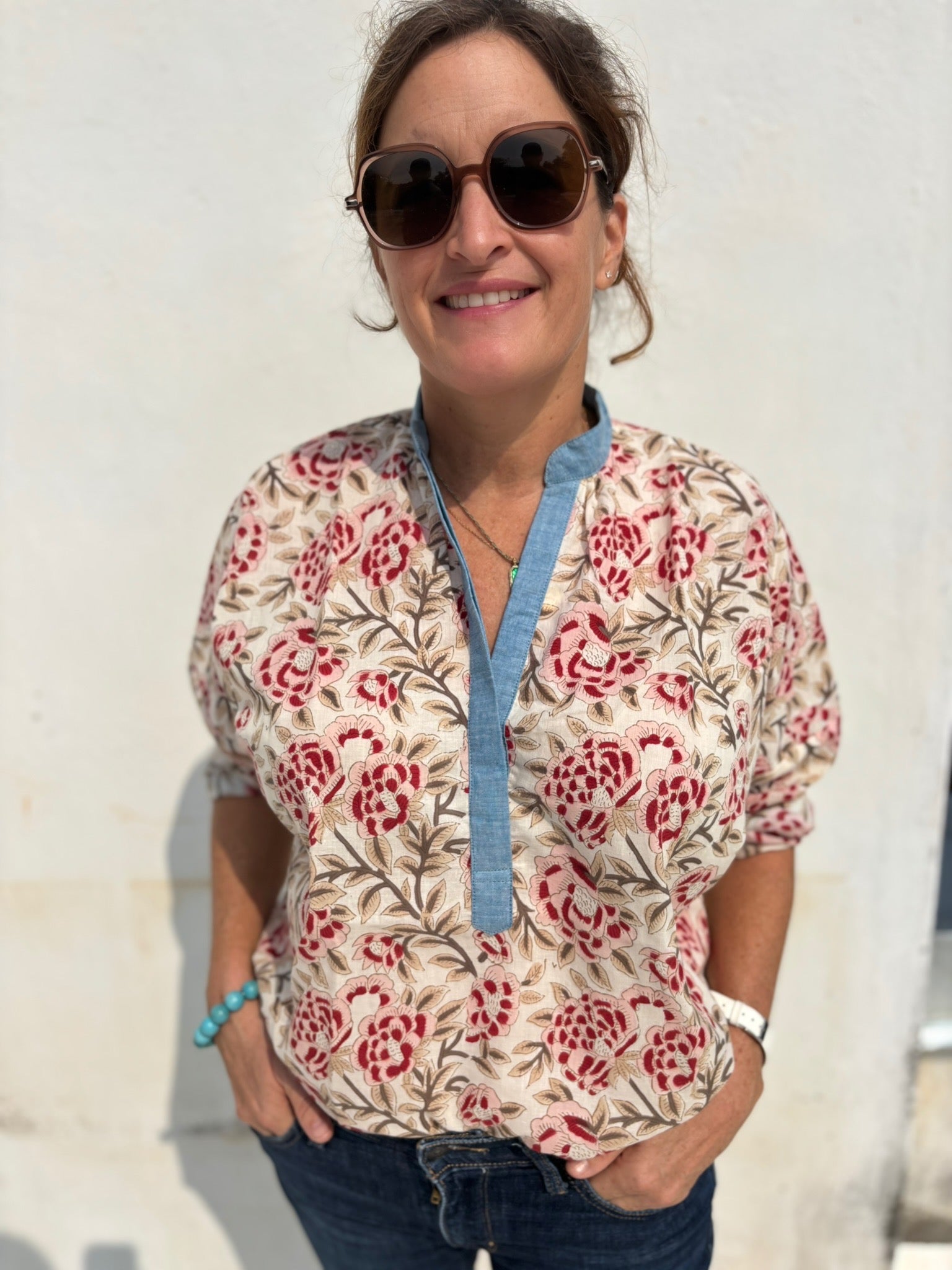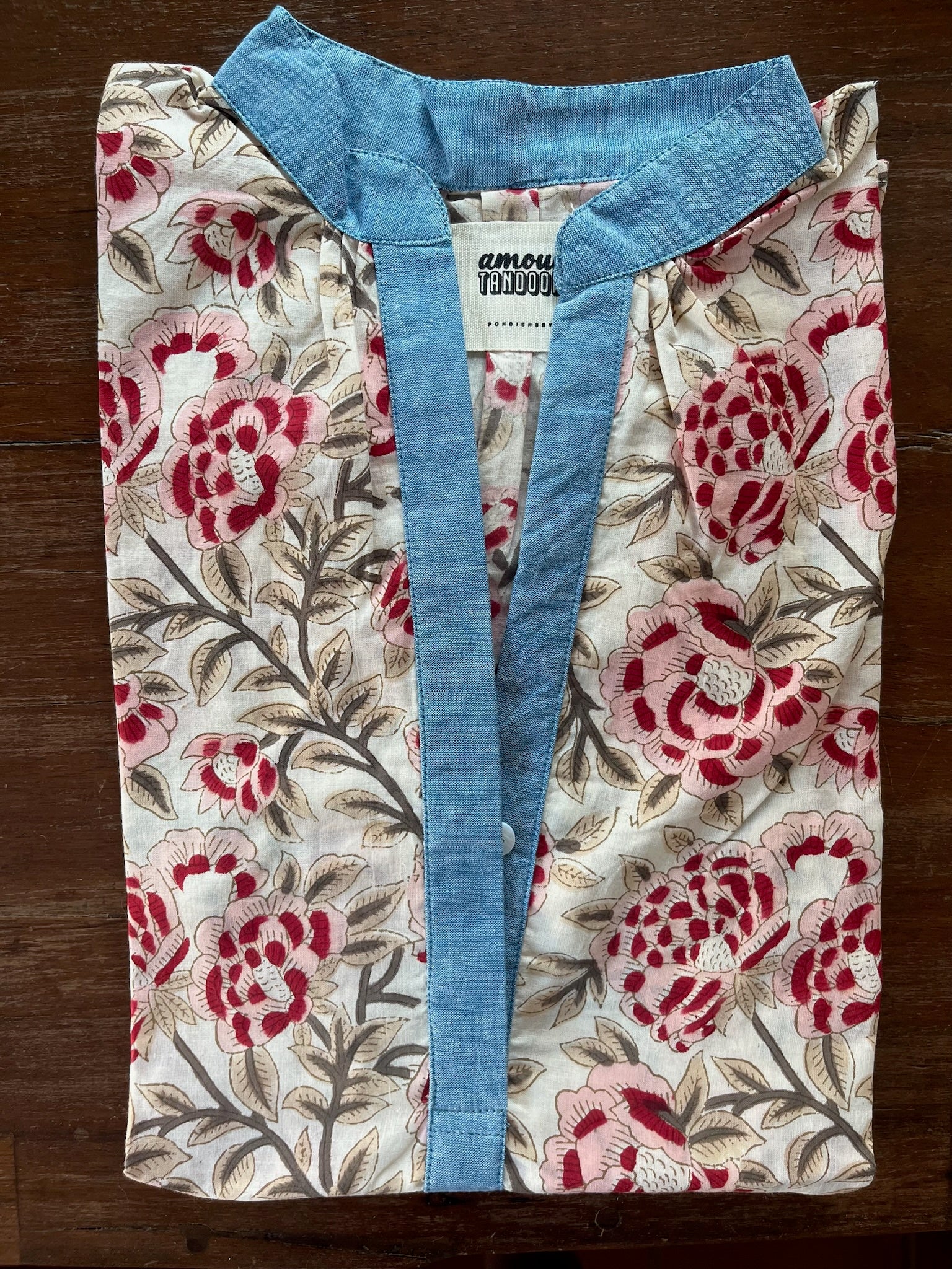 🧵 Corps de chemise en blockprint fleuri ; Col, patte de boutonnage et revers de poignets bleu.