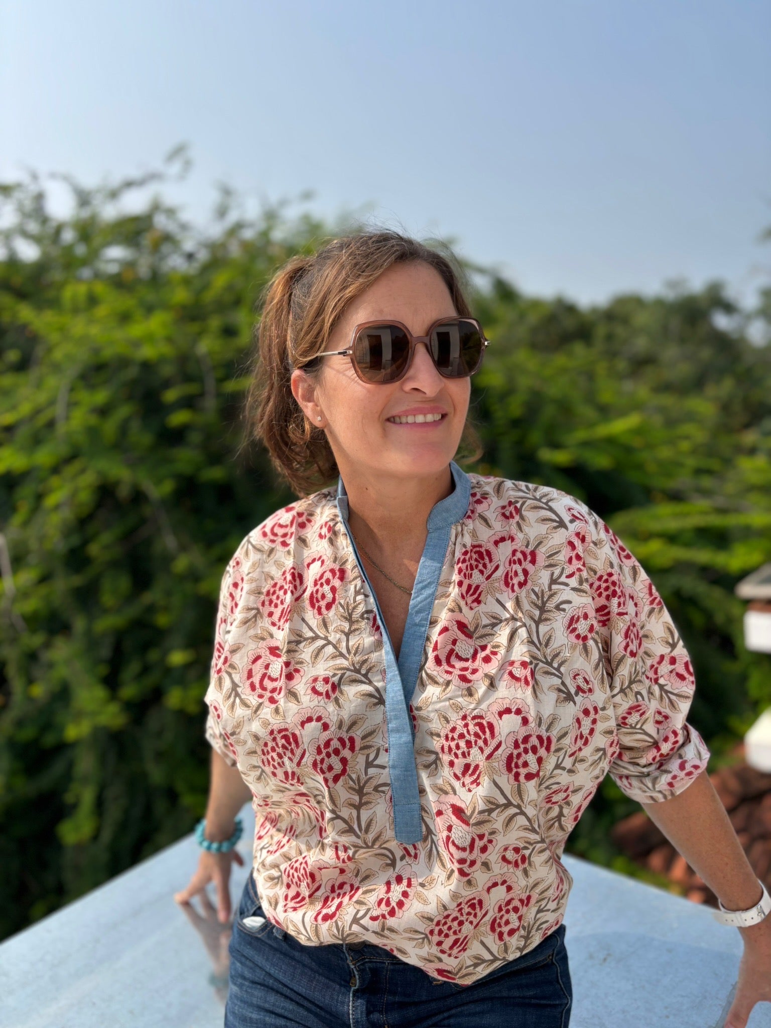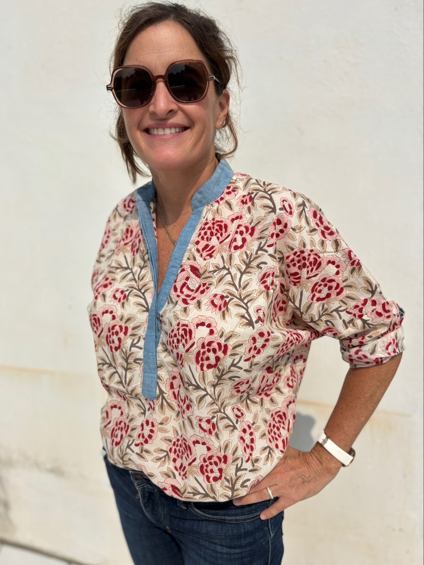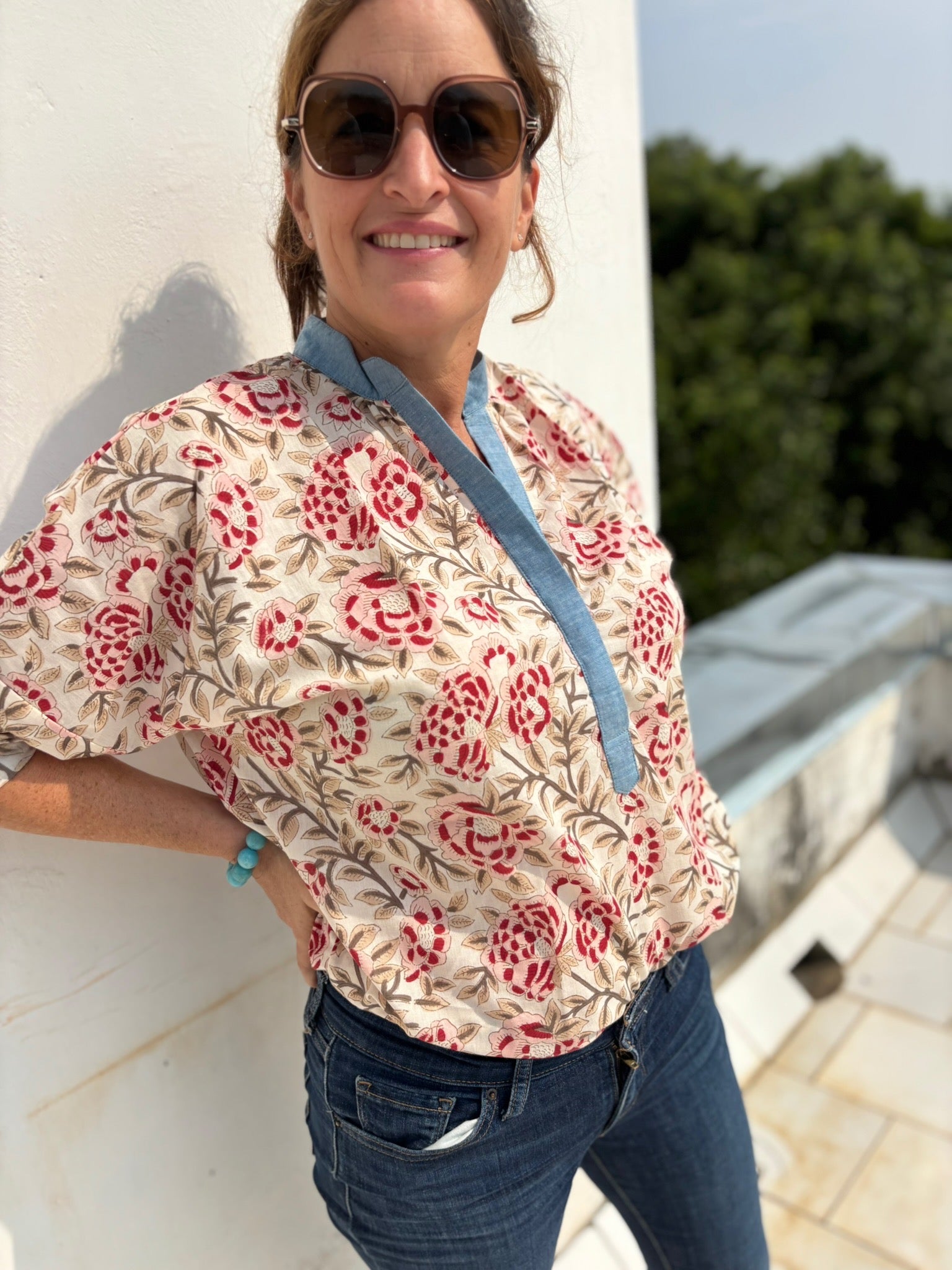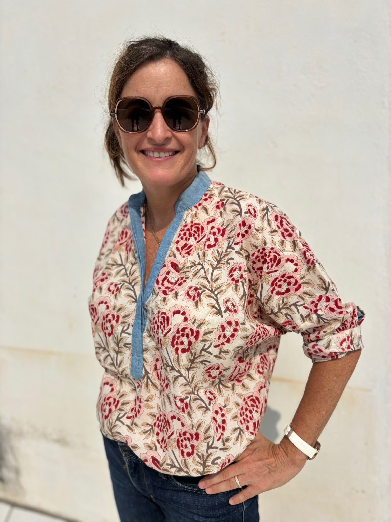 🧵 Corps de chemise en blockprint fleuri ; Col, patte de boutonnage et revers de poignets bleu.