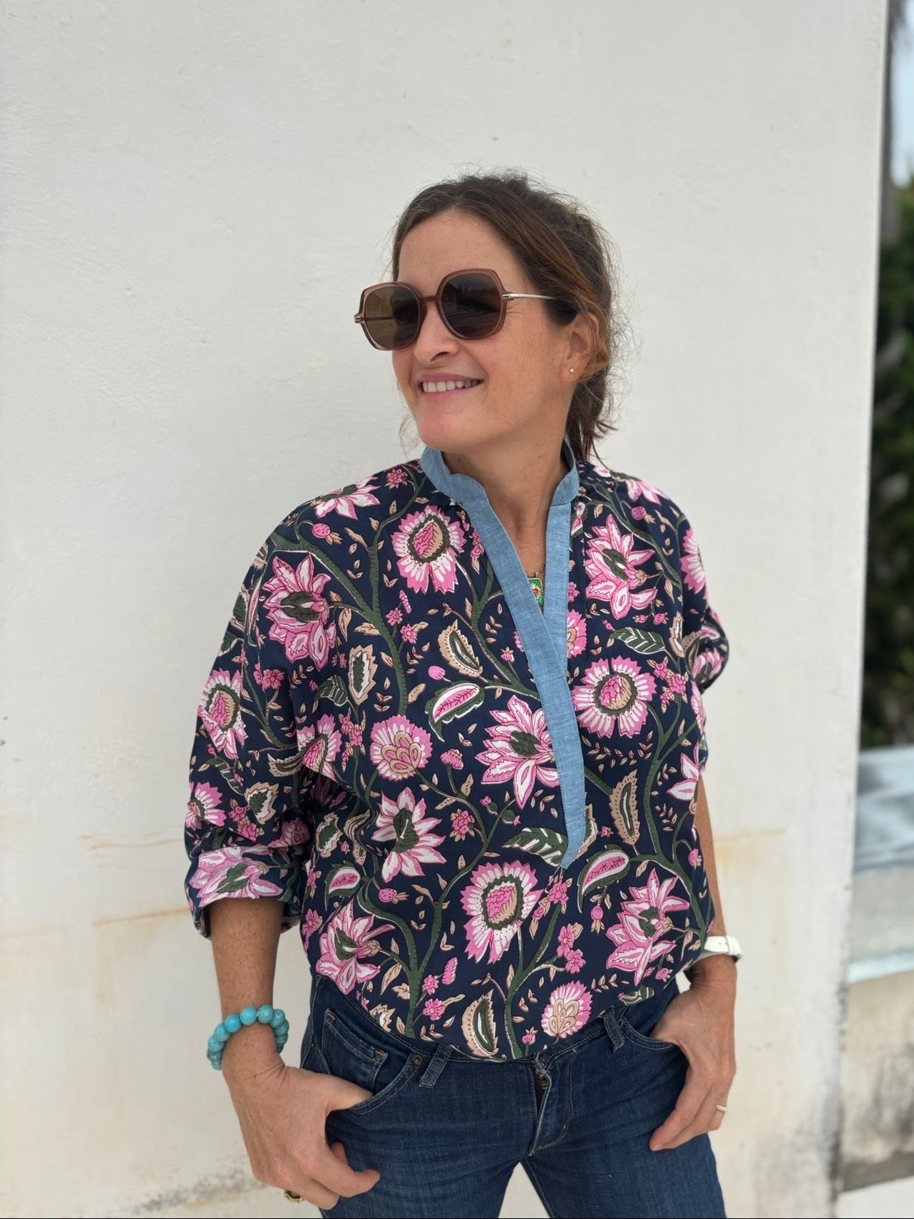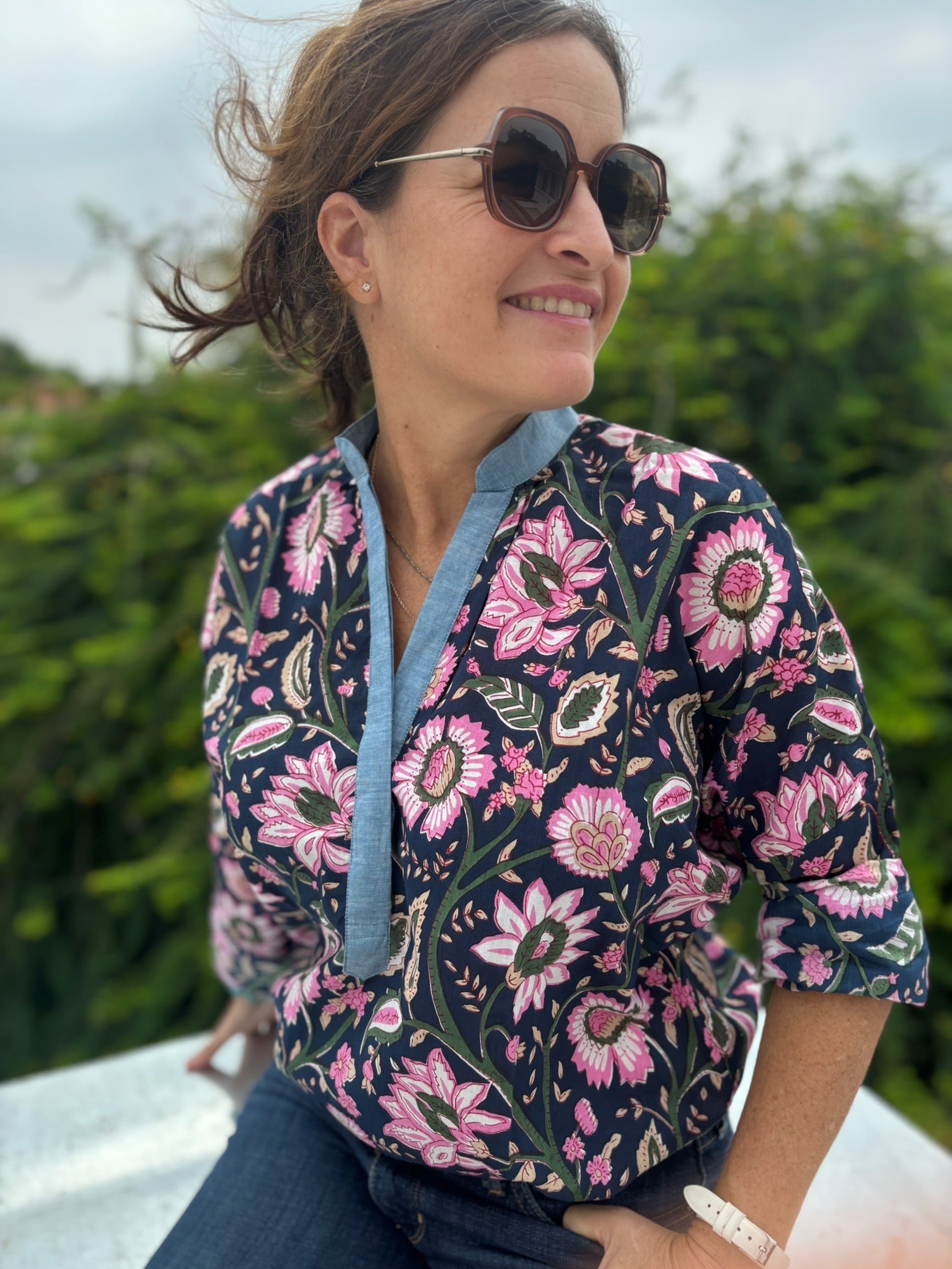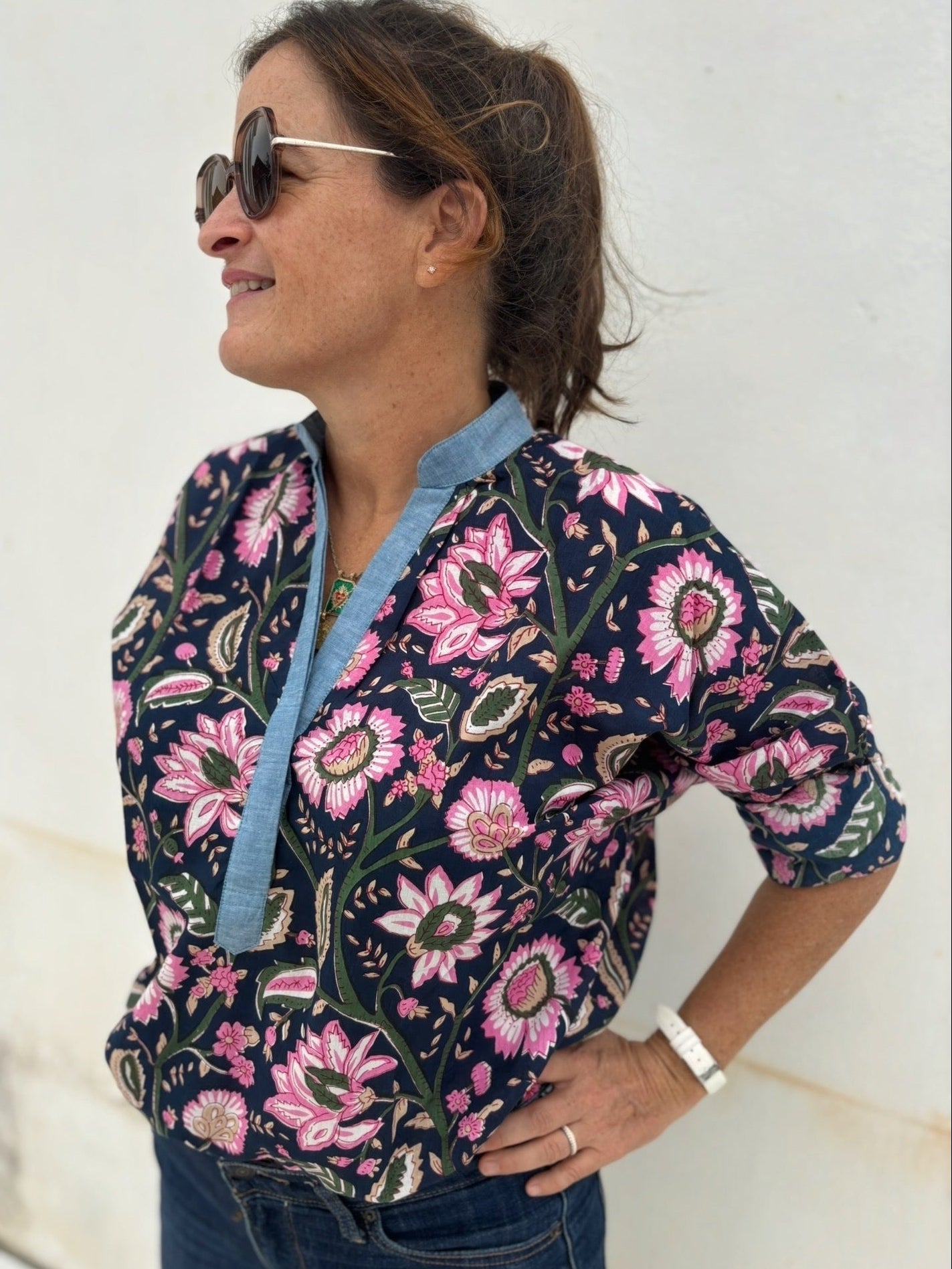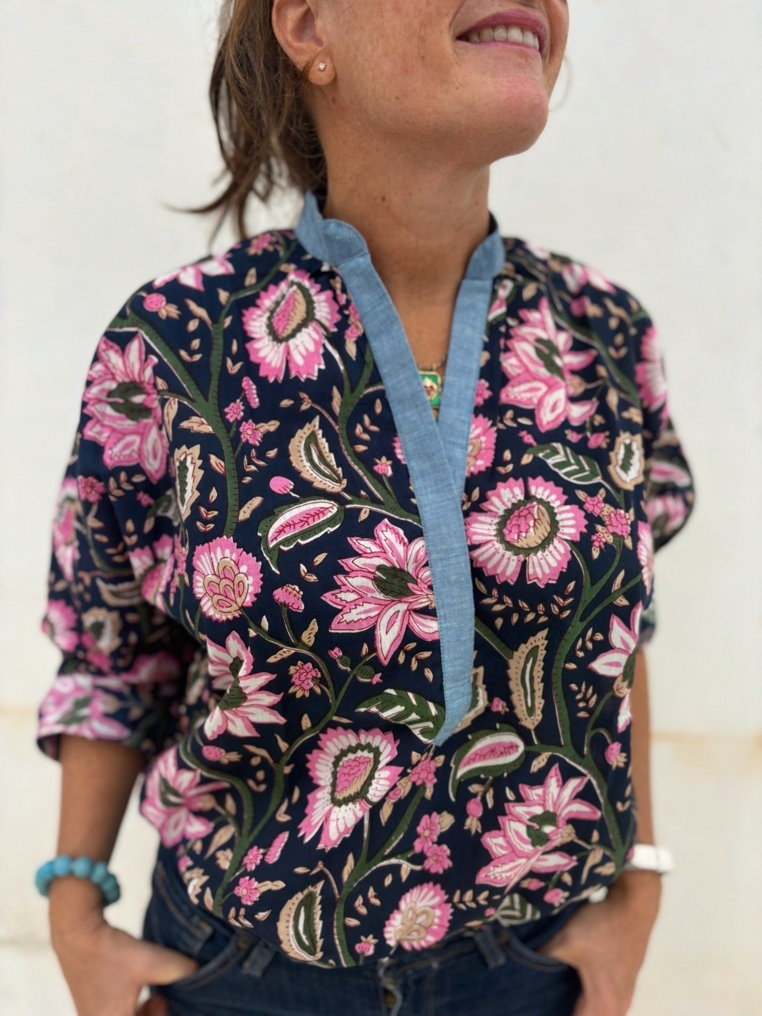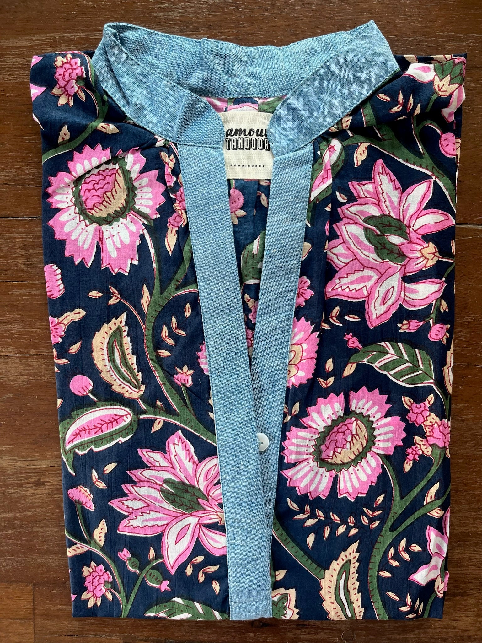🧵 Corps de chemise en blockprint fleuri ; Col, patte de boutonnage et revers de poignets bleu.